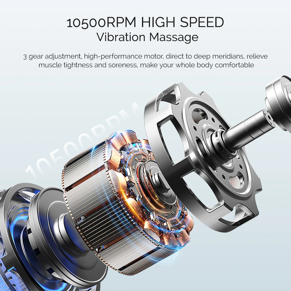 The device uses vibration therapy to reach deep muscle layers, helping release tension, knots and stiffness quickly.